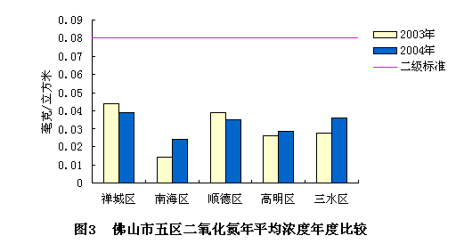 本年度禅城区二氧化氮年平均浓度为0.039毫克/立方米,比上年下降11.4%;南海区二氧化氮年平均浓度为0.024毫克/立方米,比上年上升71.4%;顺德区二氧化氮年平均浓度为0.035毫克/立方米,比上年下降10.3%;高明区二氧化氮年平均浓度为0.029毫克/立方米,比上年上升11.5%;三水区二氧化氮年平均浓度为0.036毫克/立方米,比上年上升28.6%。各区二氧化氮年平均浓度均达到国家环境空气质量二级标准,见图3。