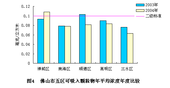 本年度禅城区可吸入颗粒物年平均浓度为0.108毫克/立方米,比上年上升16.1%;南海区可吸入颗粒物年平均浓度为0.078毫克/立方米,比上年下降1.3%;顺德区可吸入颗粒物年平均浓度为0.081毫克/立方米,比上年下降21.4%;高明区可吸入颗粒物年平均浓度0.083毫克/立方米;三水区可吸入颗粒物年平均浓度为0.063毫克/立方米,比上年下降17.1%。禅城区可吸入颗粒物年平均浓度超过国家环境空气质量二级标准,其他四区可吸入颗粒物年平均浓度均达到国家环境空气质量二级标准,见图4。