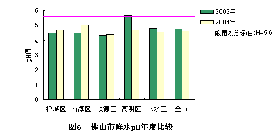 全市五区降水pH平均值均小于5.6。其中禅城区降水pH年平均值为4.66,比去年上升了0.20个pH单位,酸雨频率为84.7%,比去年上升4.7个百分点;南海区降水pH年平均值为5.00,比去年上升0.55个pH单位,酸雨频率为76.5%,比去年下降11.9个百分点;顺德区降水pH年平均值为4.35,比去年上升0.01个pH单位,酸雨频率为63.9%,比去年上升2.3个百分点;高明区降水pH年平均值为4.68,比去年下降了0.98个pH单位,酸雨频率为66.2%,比去年上升31.2个百分点;三水区降水pH年平均值为4.52,比去年下降0.24个pH单位,酸雨频率为79.2%,比去年下降0.4个百分点。2004年禅城区、顺德区、高明区的酸雨频率均有所上升,南海区、三水区的酸雨频率有所下降。五区降水pH平均值与酸雨频率年度比较如图6、图7所示。
