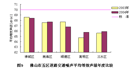 2004年佛山市区域环境噪声平均等效声级为56.3分贝,达到区域环境噪声2类区昼间标准(即60 dB(A)),达标率为77.5%。2004年五区区域环境噪声平均等效声级与2003年比较如图8。